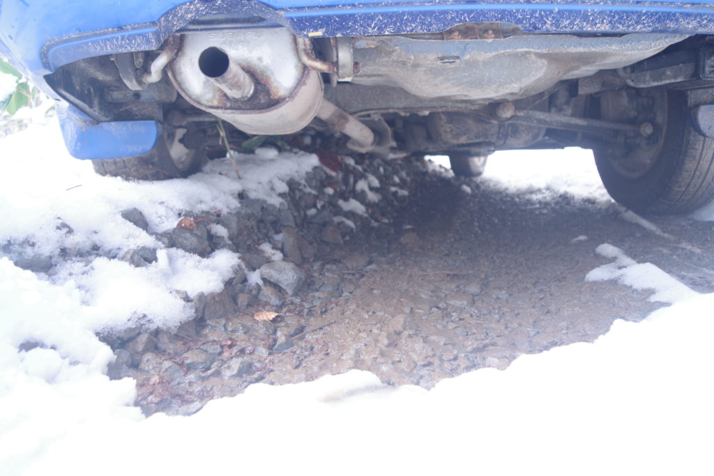 しかし、実際にその道を走ると積雪はほぼありませんでしたが、轍がかなり深く、車体の下回りを擦ってしまうこともありました。片輪を、轍と轍の間に乗せて、できるだけ下回りを擦らないようにしていたのですが、打ち所が悪かったのでしょう。しばらくして、クラッチが滑っているような感触がしました(AT車ですが)。低速で走行しているのに、エンジンがかなりの高回転で回ります。これはトランスミッションが壊れてしまったようです。そこから数十メートル走ったところで、かなり深い溝が前にあることに気付き、停車しました。そして、そのまま車は動かなくなってしまいました。ぼくは降りて、手で坂の下の方に押してしまいました。これは今考えるとかなり愚かな行為でした。車が動き出したと思うと、坂を転がり落ちていきました。運よく、道の途中で止まってよかったです。車が止まった場所は、旗坂キャンプ場と桑沼キャンプ場の中間地点あたりでした。