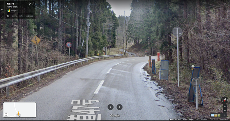 2つ目は、ここだ。最初のきついコーナーから数個連続したコーナーを抜けてすぐの場所にある。ここは、道の幅が急に狭くなる。小型車なら二台すれ違えるが、よほど車幅感覚にすぐれた人でない限りは、譲り合う方が賢明だ。私はインプレッサスポーツワゴンでハイエースとすれ違ったことあるけど怖かった……