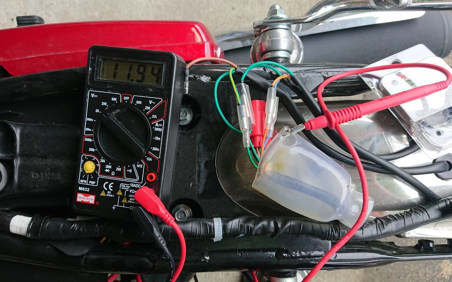 そして、その中からキーon時に12V流れているヤツを見つけます!ボクのCG125は茶色い線だった。