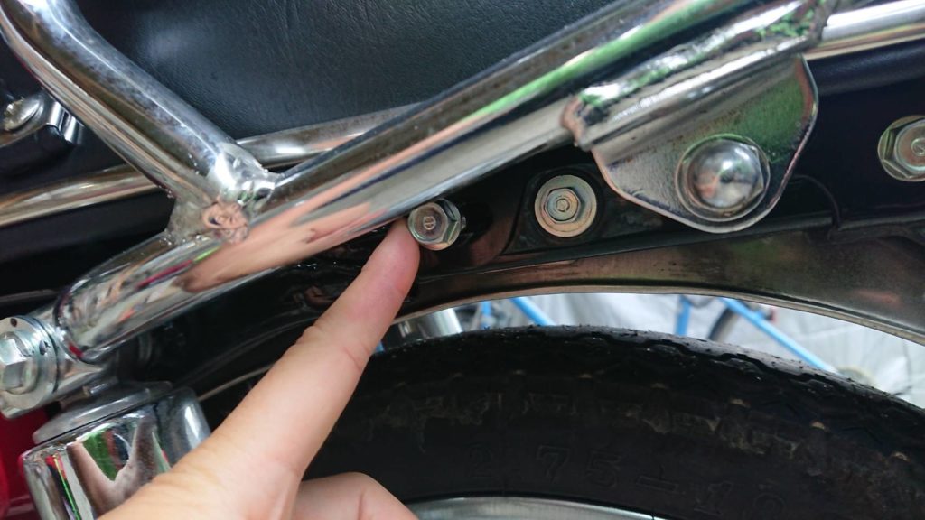 写真で指をさしているところにあるボルトを左右合わせて2本外すだけで簡単にシートを外せます。